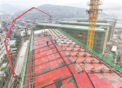 元旦假期期间,许多行业的劳动者依然坚守岗位,在工作中度过假期。图为近日,工人在湖北省襄阳市麒麟中学建设项目工地浇筑屋面水泥。 新华社发(谢勇 摄)