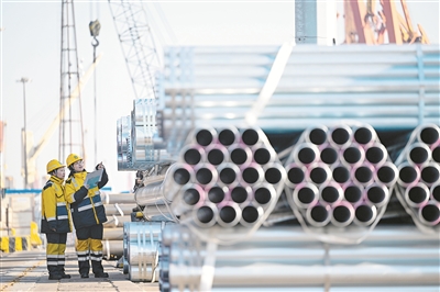 图为近日,在天津港第一港埠有限公司的码头货场,身着黄色工装的女性理货员在核对货物的货号。 新华社记者 赵子硕 摄