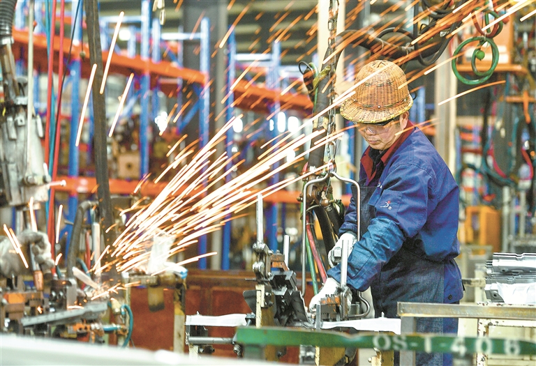 2月25日,在位于安徽省合肥市肥西县的一家汽车零部件加工制造企业,工人在生产线上进行焊接作业。 新华社发(徐勇 摄)